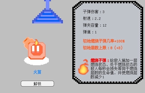 解锁该功能需要消耗1500金币,使用时存在触发燃烧子弹的概率,一旦命中敌人,就会为其附加一层燃烧效果,该效果会按照当前层数每秒对敌人造成持续的燃烧伤害。