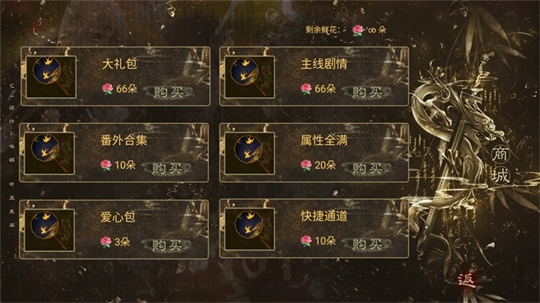 因为这款游戏已经实现无限鲜花功能,所以我们能够直接进入鲜花商城,购买大礼包、番外合集、主线剧情等各类商品。