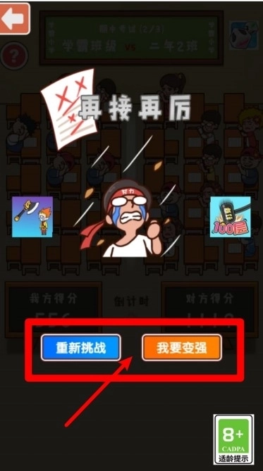 挑战失败后,你可以选择“重新挑战”或“我要变强”这两个选项,选择前者就能重新开启当前关卡,选择后者则会进入强化界面,从而提升班级的整体战斗力。