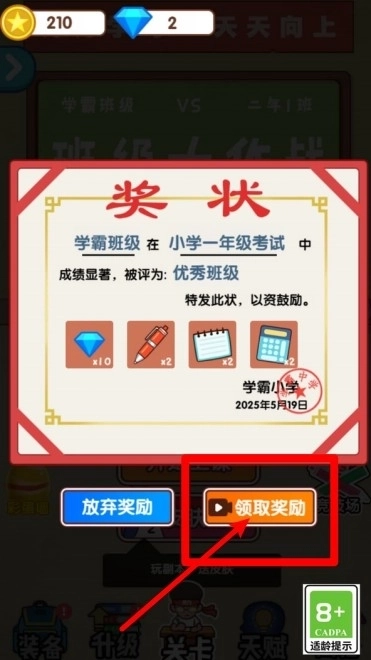 点击奖状界面里的“领取奖励”按钮,就能获得额外资源,一般需要观看广告视频,这是快速积累资源的常用方法。