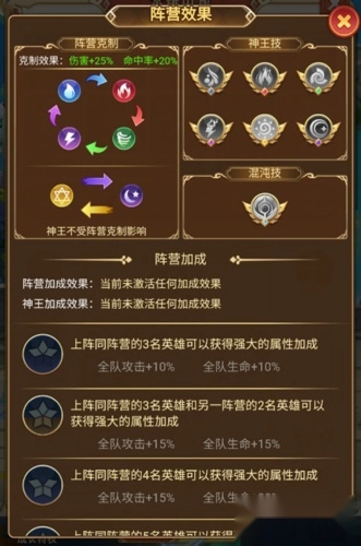 6、英雄之间还存在阵营效果,包括克制和加成,玩家可以根据阵营效果进行英雄阵容搭配。