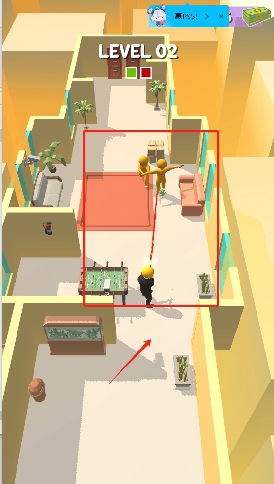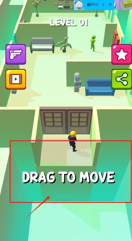 戴着黄色头盔的小人站在房间门口,左上角的紫色枪形图标能用来射击,右上角的星星图标或许代表奖励。拖动屏幕可以调整视角,我们的目标是消灭敌人,从而赢取PS5。