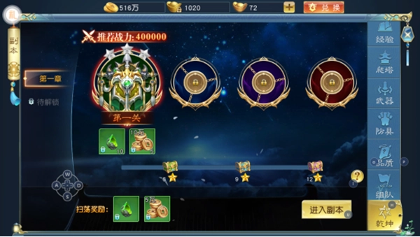 通关乾坤秘境能得到大量乾坤石奖励,每个关卡可以无限次进入,但普通奖励只能领取一次。通关后会依据通关星数获得丰厚奖励。玩家每日通关的最高关卡对应的奖励将在次日0点发放。