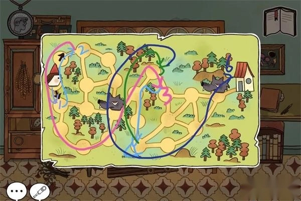 8、【男主1909】点击柜子上面一排抽屉,拿出日记本,将蝴蝶花纹按照刚刚看到的红色图示排列(点击相邻两个图案可以调换位置),打开后翻看手册,取出地图,记住19080216*60几个数字。点击椅子上的背包,将地图放入