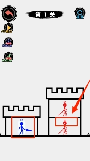 需要通过战斗来进行爬塔,数字代表武力值,点击那些需要战斗的红色火柴人就能开启斗争。