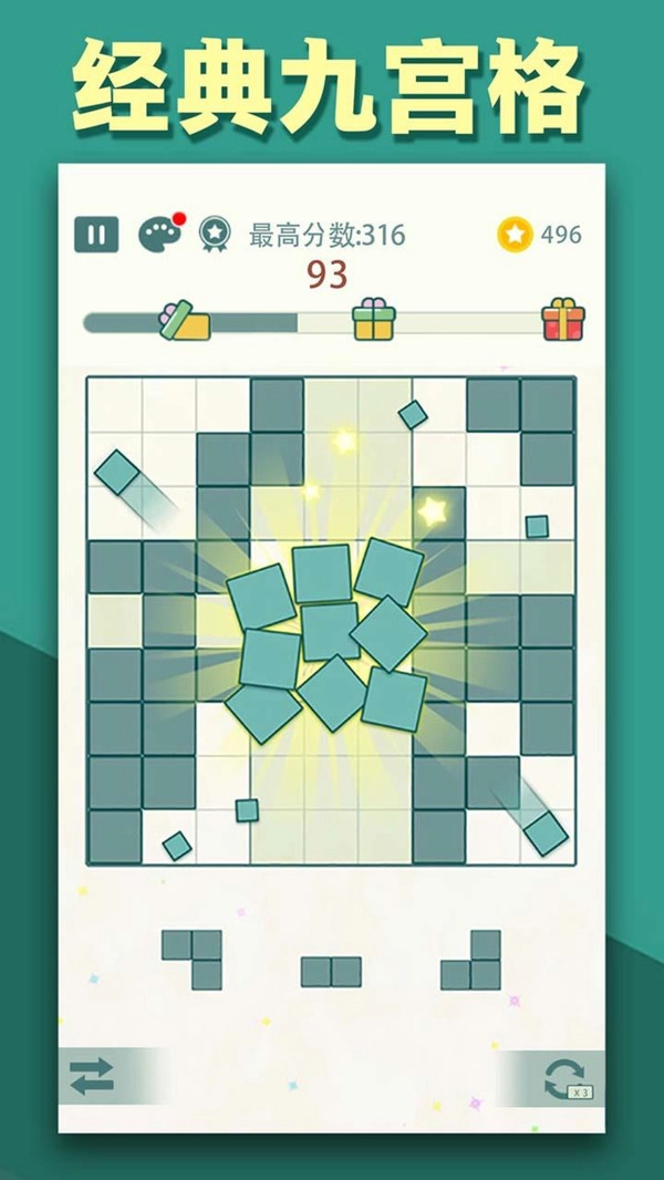 每次只要填满一个九宫格方块,或是填满棋盘的任意一横排、一竖排,都能进行一次消除。