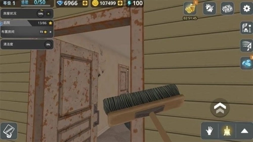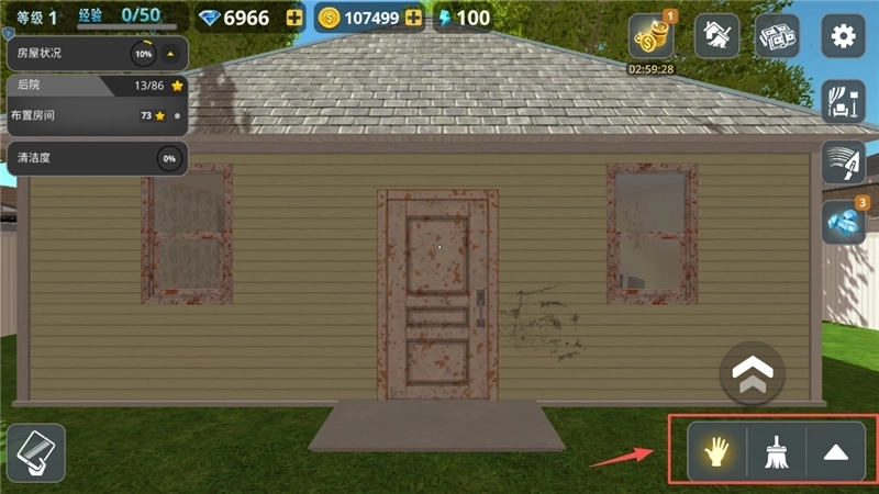 首先进入游戏主界面,映入眼帘的是一座等待翻新的老房子。在左上角可以查看自己的等级、钻石金币数量以及电量情况,之后点击右下角的手型图标或者刷子图标即可。