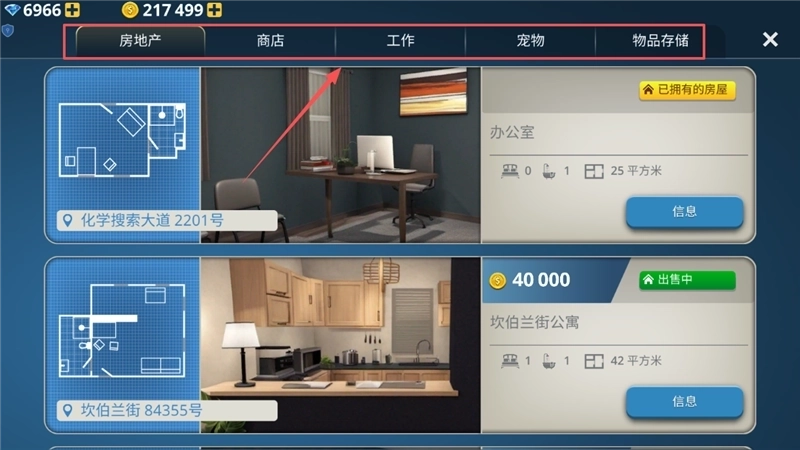 若您有购买房产或管理现有房产的需求,可点击页面上方的“房地产”选项卡。在该板块中,会清晰展示您已持有的房产以及当前处于出售状态的房屋,每套房产都配有详尽的价格、面积及设施配置等信息。