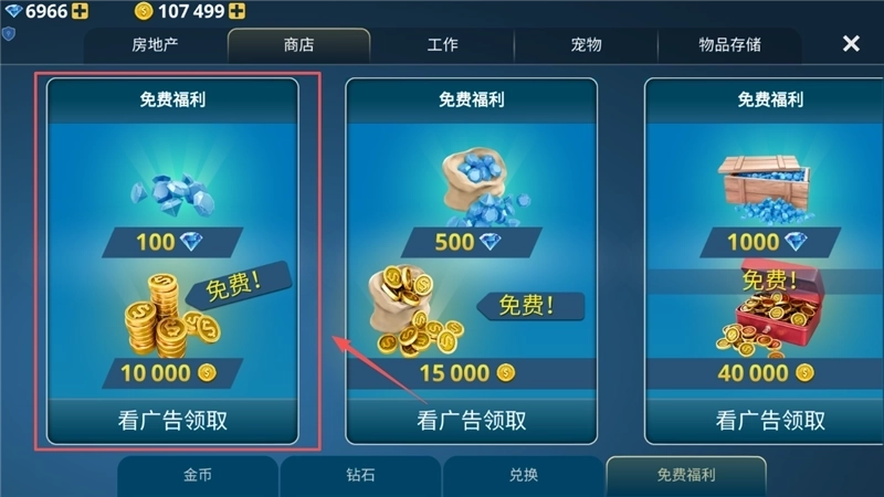 想最快获取资源的话,直接点击“商店”,找到“免费福利”板块就行。这个区域一般会有三个能领取的钻石和金币礼包。