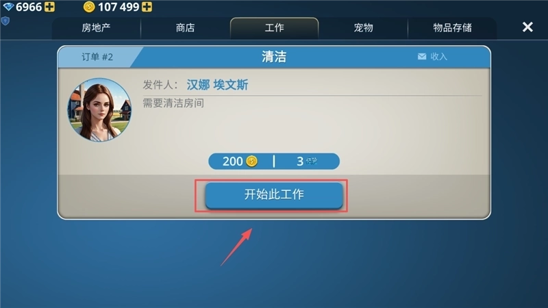 想要赚钱和积累经验的话,可以点击“工作”选项卡。在这里你会看到类似清洁房间之类的订单,每个订单都清楚地标明了对应的报酬和完成所需的时间,只需点击“开始此工作”按钮就能接下任务了。