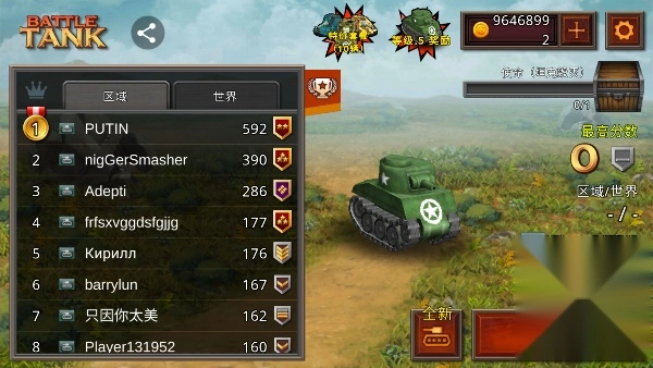 这里能看到区域排名,点击“全新”按钮可以为坦克升级,然后点击“开始战斗”即可。