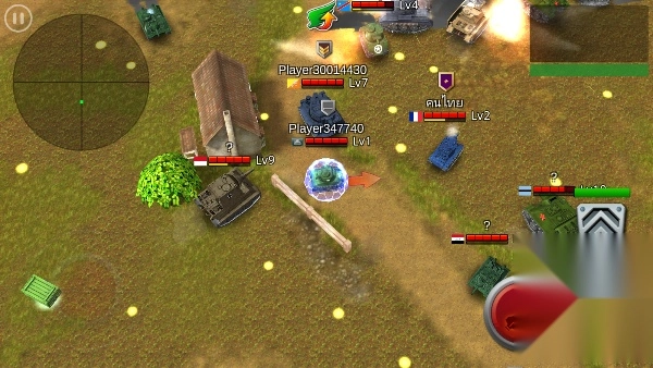 这个战场十分激烈,你得在众多玩家里争夺排名。滑动左侧的轮盘来控制方向,点击右下角的红色按钮就能攻击其他小坦克。攻击他人时也要留意防御敌方的射击,要是看到右下角那种箱子,就移动过去获取它。