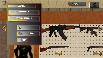 每种武器都能看到对应的名称、伤害值、攻击速度、子弹类型以及价格,例如AK74的售价为2500美金。