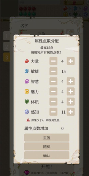 这个加点方案不再采用力、智、魅的鉴定模式,具体分配如下:敏捷先加到18点(解锁杂耍1),感知加到13点(解锁求生1);之后敏捷继续加到27点(解锁杂耍2),感知提升到20点(解锁求生2),体质初始点6点即可。剩余的点数可以随机分配,若流程中出现增加体质的事件,可考虑将体质冲刺到13点(解锁稳定1);若没有此类事件,则剩余点数可全部投入敏捷。