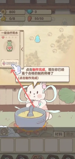 搅拌好药锅后,点击旁边的荷叶进行加热,待弹出一级治疗药水后,点击“制作完成”即可。