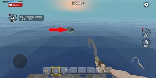 通过左边的方向盘操控角色移动,右侧的钩子按钮可用来收集海面上的材料。