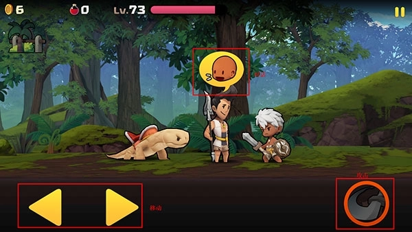 当靠近人物时能够触发对话功能,左侧按键负责操控角色移动,右侧区域对应技能释放,而接近怪兽后角色会自动发起攻击。