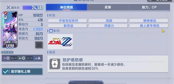 4、游戏中不同稀有度的机体等级上限也不一样,最高为UR可以升至100级。其他品质的机体可以通过开发路线图来获得SP化芯片,这样可以将UR以外的机体SP化,并且将等级上限提升至100。
