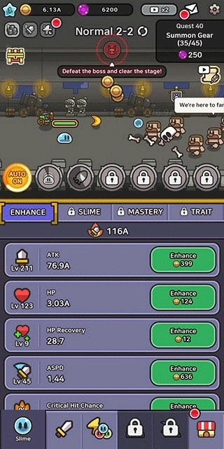 史莱姆大冒险最新版(LegendSlime)是一款软萌又解压的动作冒险!扮演圆滚滚的史莱姆守护怪物森林,人类入侵?抄起武器击垮他们!操作巨简单——升级攻击、生命等属性,自动战斗解放双手,刷装备、抽技能、养宠物,还能解锁超多冒险故事。对战、休闲模式任选,关卡和BOSS越打越上头,从新手到大佬都能找到乐趣。想找款轻松又有成就感的冒险游戏?这史莱姆超靠谱,赶紧,和小伙伴一起守护森林吧!