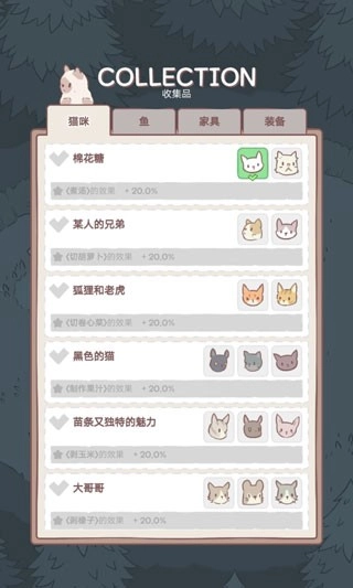 在收藏品里面有着你收藏的猫咪、鱼、家具和装备;