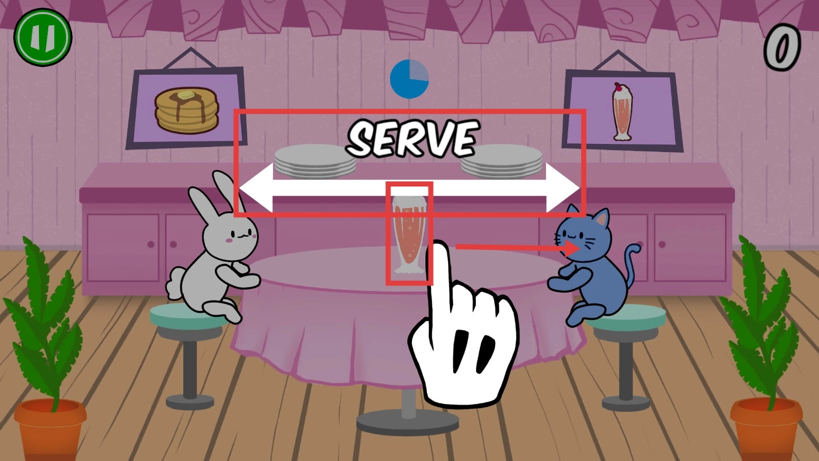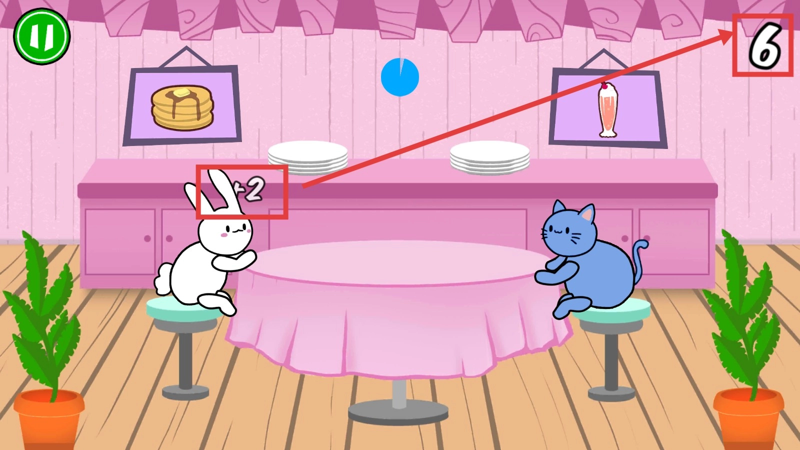 玩家要和兔子分享桌上的煎饼,和猫分享奶昔。要是分类出了错,对应的角色就会生气。