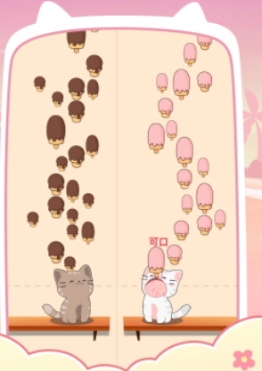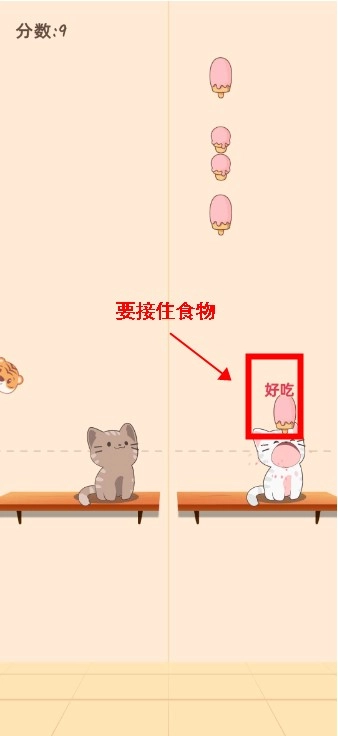 根据音乐节奏拖动猫咪移动让它们接住掉落的食物。