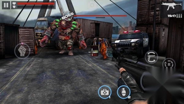 巨岩怪是前期任务中的一头拦路虎,是僵尸头目,有着超高的血量和攻击,如果武器不好的话根本无法将其击杀。在准心那里有个油桶,当巨岩怪走到那里的时候攻击油桶它就会爆炸,对巨岩怪造成伤害。在这里还要同时注意其他小僵尸,被围攻了很容易死掉,建议这一关买了第三个武器(散弹枪)的时候进行尝试