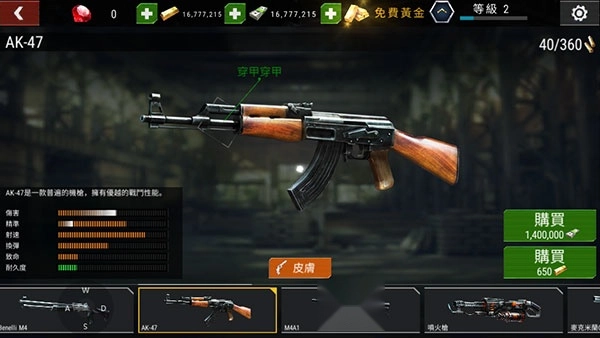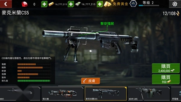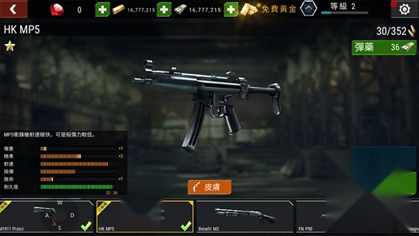 需要升级才能解锁更强力的枪支,并需要黄金购买才能使用。游戏开始送一把初始的手枪和冲锋枪,使用游戏现金升级,升级次数也是受玩家等级影响。在无法购买后续的枪支时,升级已有的枪支是不错的选择