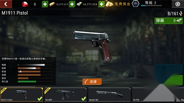 -m1911手枪:初始手枪,威力过小,射速输出中等,弹量倒是不错,唯一的优势是换弹速度快,前期可以用来做一些简单的任务。这枪适合对付初始的机械师及流浪汉僵尸,后面的毒液、警察及举盾牌僵尸和铁盔僵尸打起来力不从心