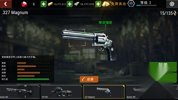 -巨蟒左轮堪称混战必备利器!它不仅弹匣容量大,射速与输出能力出色,远距离射击精度也十分可靠,最关键的是具备穿射特性——只要处于同一条直线上的僵尸,都难逃其攻击范围。此外,面对佩戴安全帽、铁盔或手持盾牌的目标,它还拥有无视防御的特殊效果。美中不足的是,它的换弹速度相对普通。