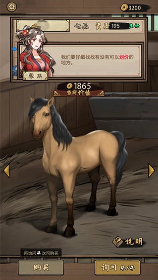 在选购跑马时,需先点击右侧箭头调整马匹身上的污点来申请降价。例如,点击马匹臀部的印记后,再选择右下角的“询问”选项,就能将价格降至对应档位。你总共有4次降价询问的机会,建议合理利用,争取以最低价格购入这匹良驹。