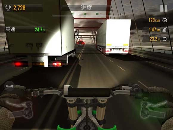 一般来说,赛车类游戏对玩家的操作要求相当高。而《公路骑手》这款游戏采用的是重力感应转向机制:玩家只需摇动设备就能实现左右转向,点击摩托车右把手位置可完成加速操作,点击左把手则会减速,操作时务必分辨清楚左右方向哦!重力感应堪称赛车游戏里最经典且贴近真实驾驶体验的操作方式,本作将加速与减速的控制位置分别设置在摩托车的两侧车把上,这与现实中的摩托车操作逻辑完全一致,能为玩家带来更强烈的真实感。