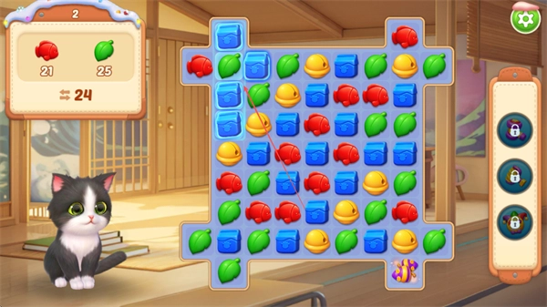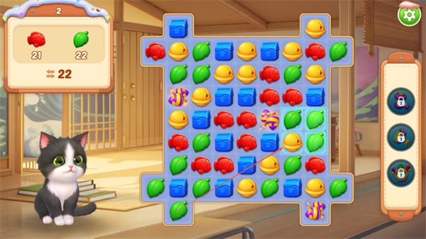 三消、建造与养成玩法实现深度联动,三消闯关的目标不再仅仅是通关,还能获取专属资源助力家园建造与猫咪养成,形成了完整且趣味十足的玩法闭环。