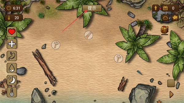 2、进入游戏主界面后,点击提示按钮可获取游戏指引,同时关注左侧的状态数值时间、温度等,借助工具图标开展物资收集相关操作。
