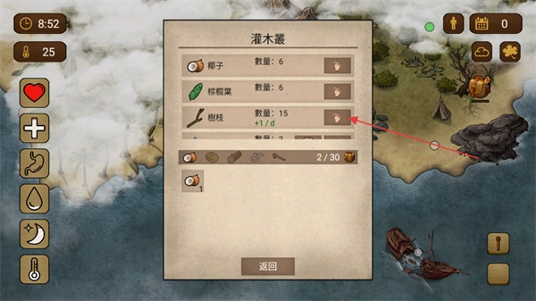 4、进入灌木丛区域后,点击物资右侧手形按钮收集椰子、棕榈叶等资源,收集的物资会存入背包,需留意背包的容量限制情况。