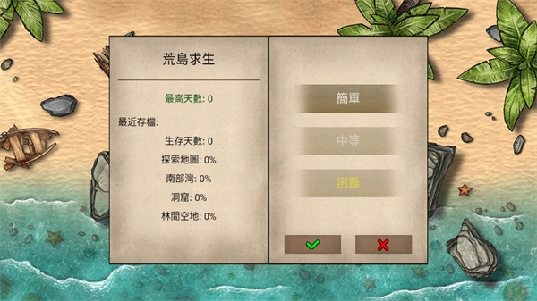 1、在荒岛生存100天的初始界面中,点击新游戏按钮即可开启游戏进程,当前最高天数与生存天数均为0,后续将开展荒岛的生存与探索。