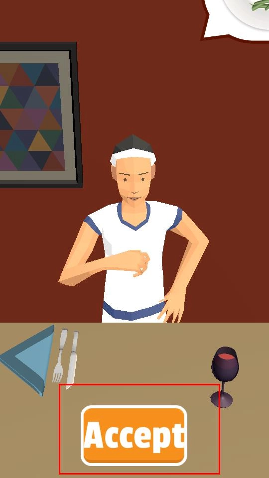 首先要进入游戏场景,面对餐桌前的人物,点击Accept按钮,接下菜品摆盘服务的任务。