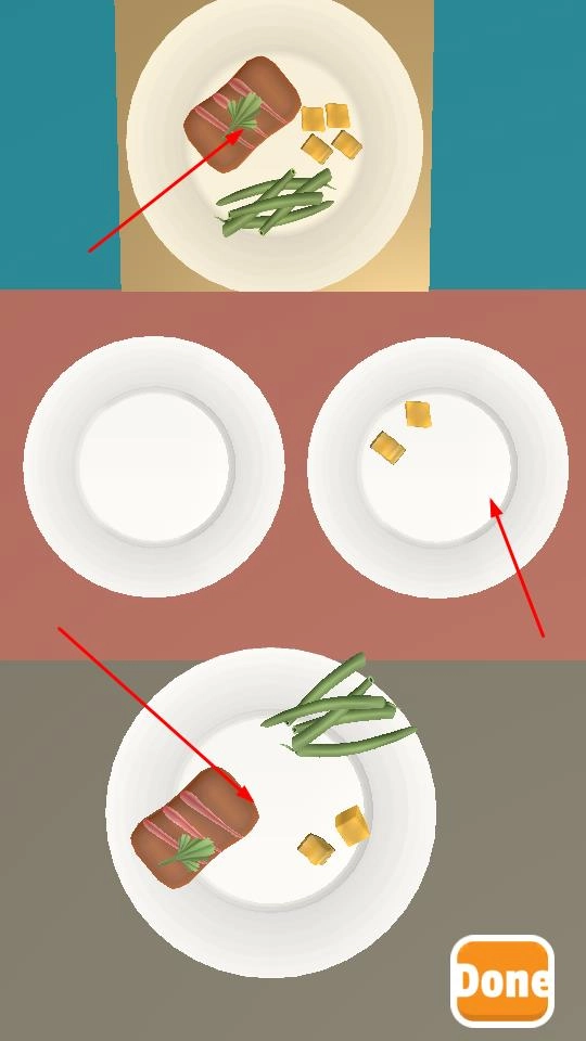 按照上方给出的菜品示例,把牛排、蔬菜、小块食物等相应食材分类放置到空盘子里,全部完成后点击Done按钮提交。