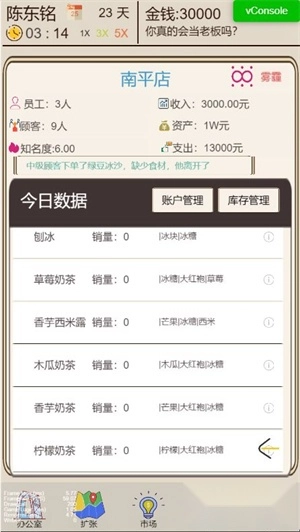 4、引入天气系统,同时天气会影响当天的饮品销量,所以记得看天气预报噢,过度的囤货可能让你的店铺血本无归。