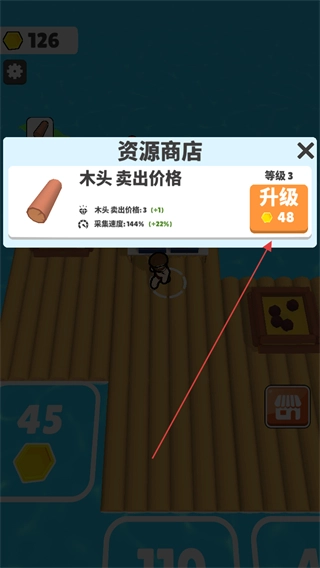 2、打开资源商店,消耗金币升级木头卖出价格如消耗48金币升级,提升后续售卖收益。