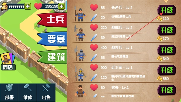 2、打开商店的士兵界面,在目标士兵的右侧找到升级按钮,消耗相应数量的金币并点击该按钮,即可提升士兵等级,从而增强其战斗属性。