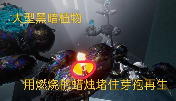 5、堵花。遇到大花(大型黑暗植物)难烧,主动站在正确的位置举火,不要乱动,堵住芽孢再生,让大佬安心去另一边烧花。