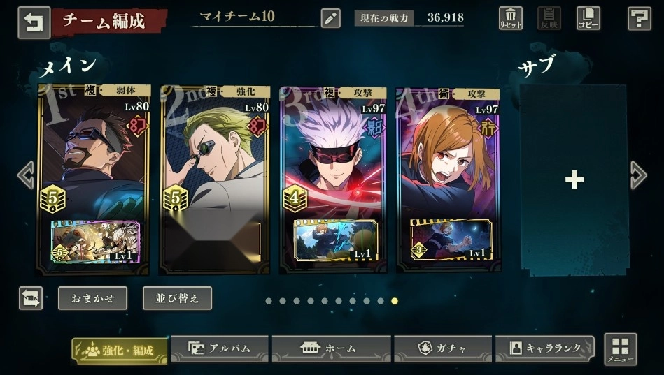 五条悟老师,前期推图最猛,萌新之友,能对单能对群,有体术有咒术,能自身增伤,大招还是超高爆发全体伤害,推图猛的雅痞,但是由于五条悟老师蛋/疼的机制,只能出7次手,打了7次就得下场,所以在高难本里面很不适用,后期来说比较乏力,但是前期最强。