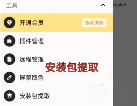 接下来打开mt管理器,点击左上角的三条横线图标,随后在左侧菜单栏里找到安装包提取功能。
