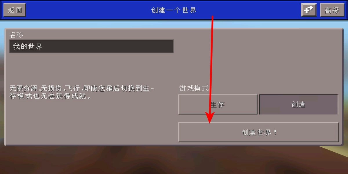 创建世界界面,可以给世界命名,还能选择模式,有生存和创造两种模式可选,选好后点击创建世界按钮,生成属于你的世界,开启探索和建造。