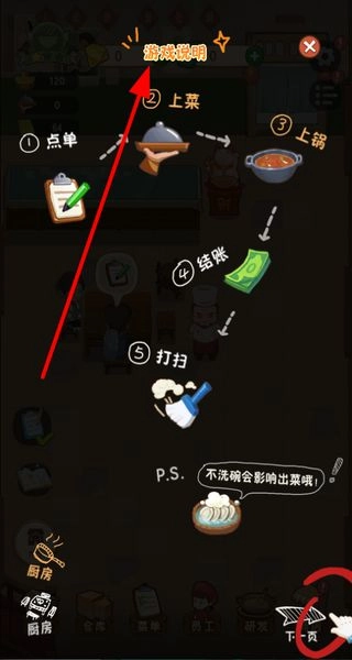 玩家能够查看游戏说明,知晓点单、上菜、上锅、结账、打扫等环节,掌握游戏玩法。