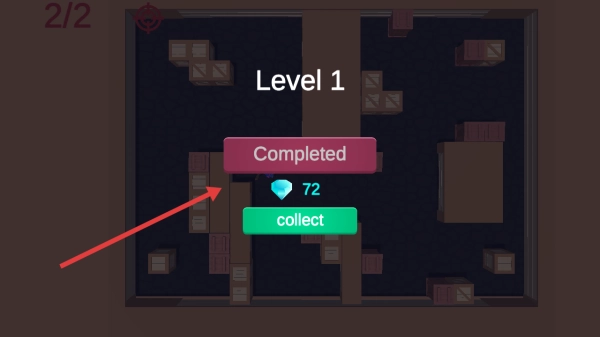 钻石收集完成后,界面会显示“Level1Completed”,此时点击绿色的“collect”按钮,就能领取72颗钻石的奖励,同时解锁新的关卡。