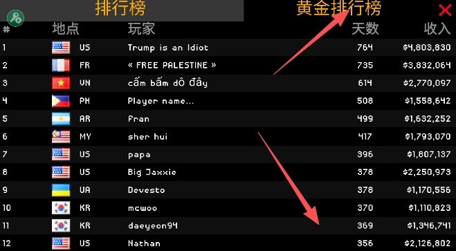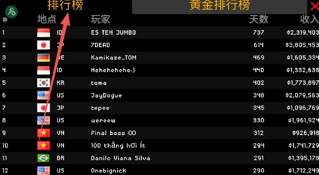 黄金排行榜针对的是游戏资历更久的玩家,考量的是他们持续的游戏天数以及累积的所有收入总和。
