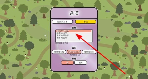 在选项界面,你可以挑选不同的剧情,比如独自在树林中等场景,还能设置日长的持续时间,以及选择是否开启教程功能。