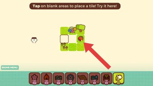 玩法是点击空白处放置瓷砖,通过组合不同的biome瓷砖来搭建场景,图中呈现了初始布局和操作指引,核心玩法为创意拼接与场景构建。